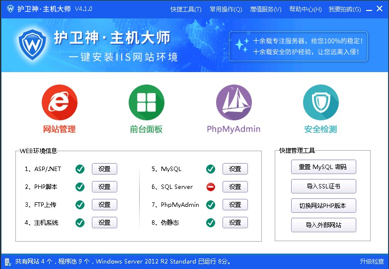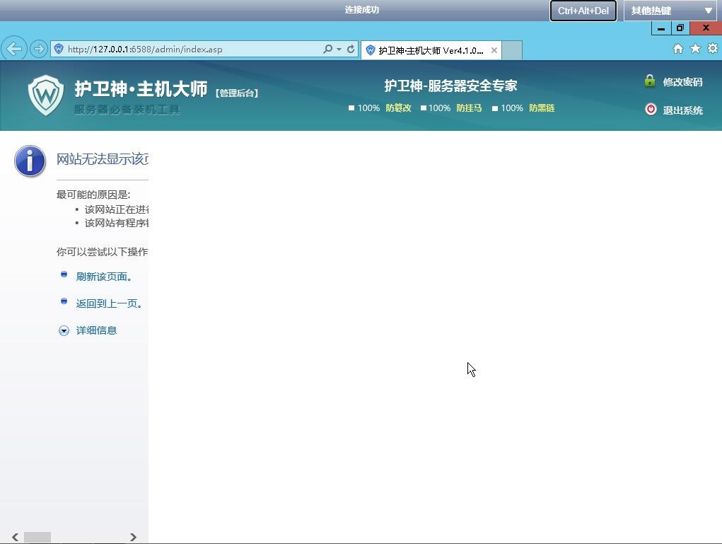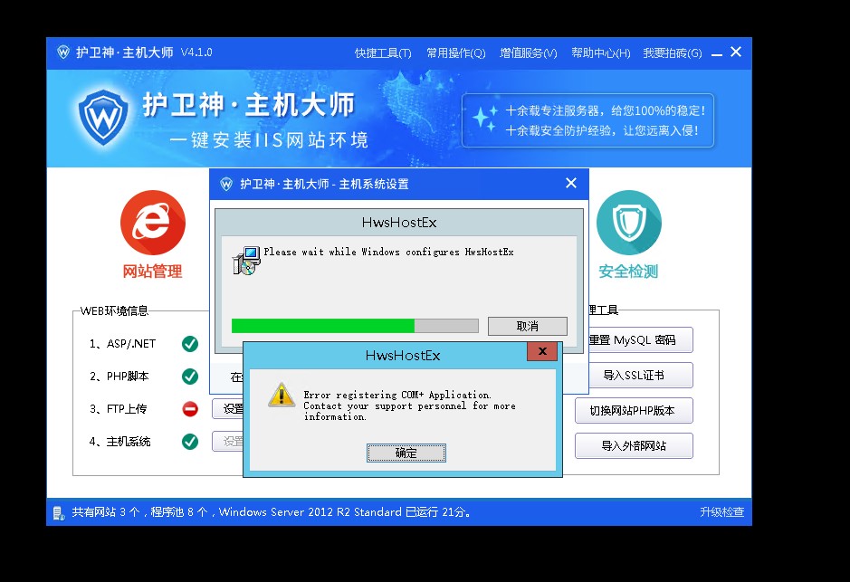 護(hù)衛(wèi)神安裝時(shí),彈出好幾個(gè) COM+ 注冊(cè)錯(cuò)誤的提示信息完成后,打開后臺(tái)面板,顯示錯(cuò)誤,如下圖