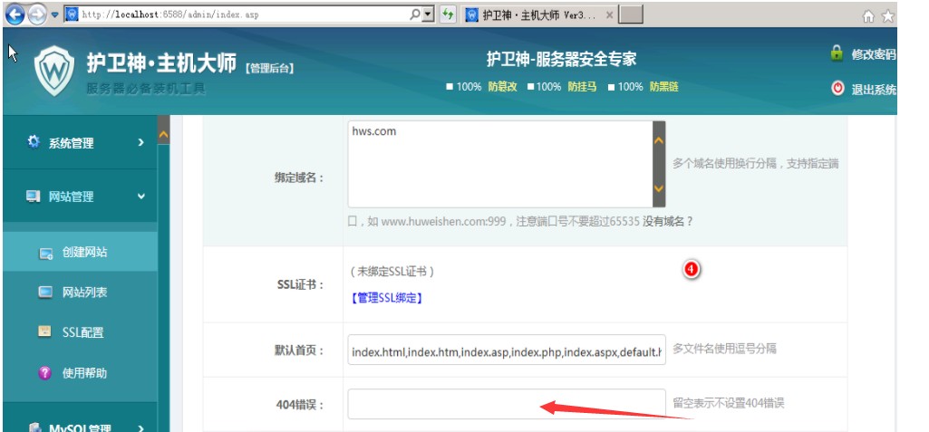 另外也可以嘗試在主機大師中設置該網(wǎng)站的404,方法: