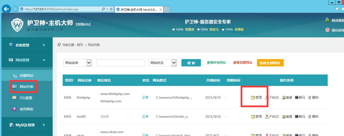 二,網(wǎng)站列表-點(diǎn)擊網(wǎng)站創(chuàng)建網(wǎng)站上對(duì)應(yīng)的“管理”