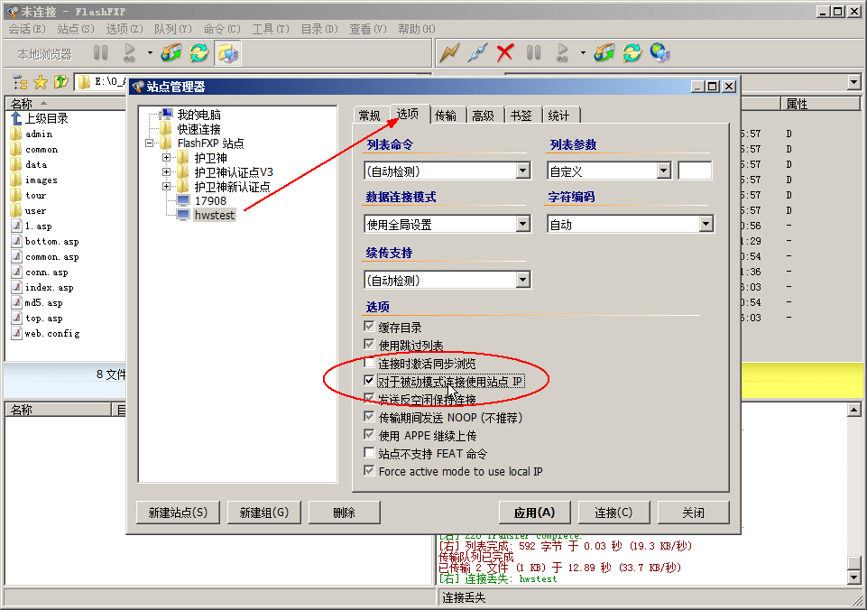 12、其他說(shuō)明:FlashFXP是一款強(qiáng)大的FTP軟件,功能很多,如果FTP密碼正確,防火墻關(guān)閉依舊連不上,可以設(shè)置“被動(dòng)模式”,如下圖: