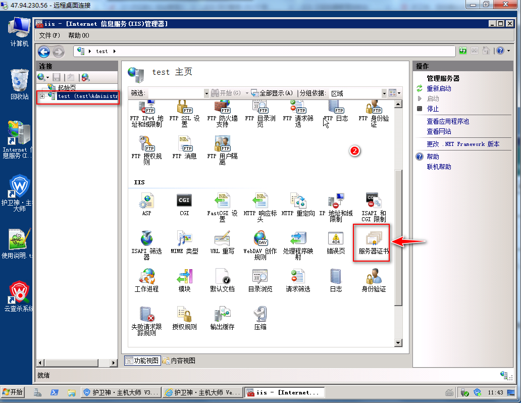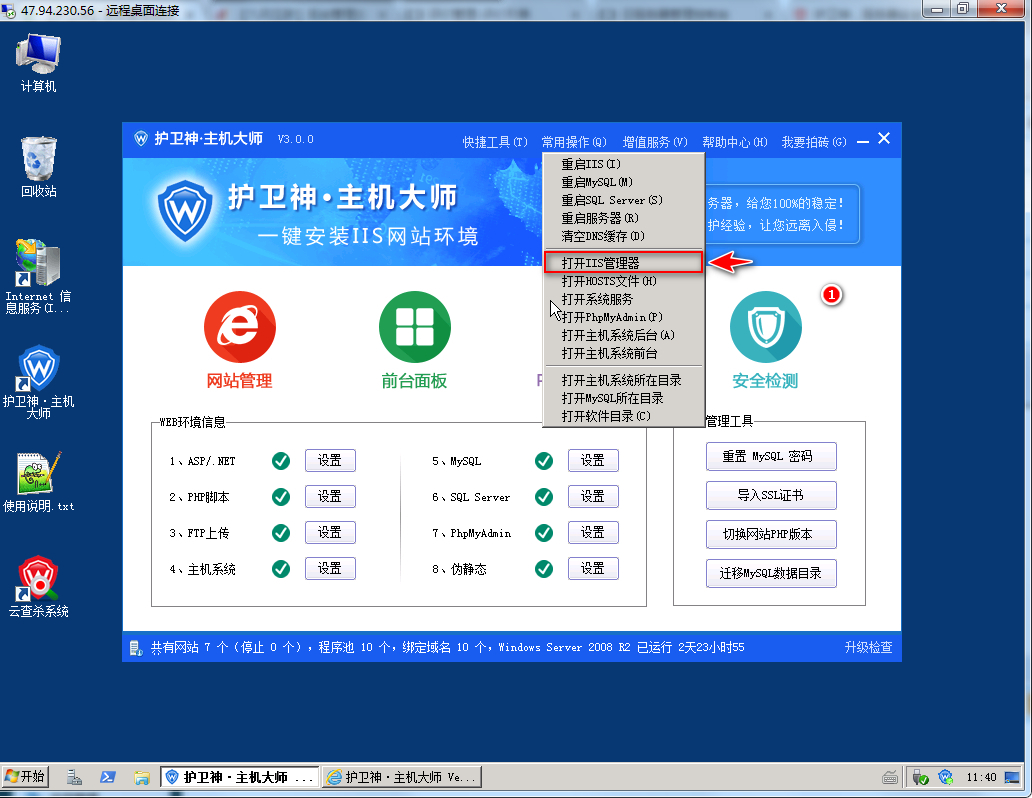 一,打開護衛(wèi)神主機大師面板-常用操作-打開IIS管理器,如下圖1