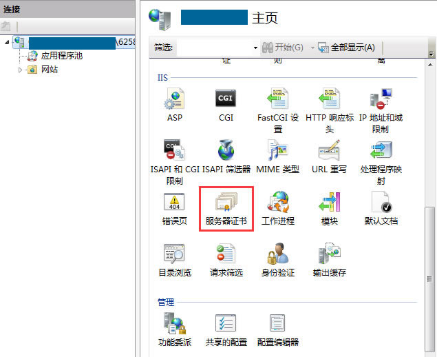 1、打開IIS,進(jìn)入“服務(wù)器證書”(如下圖):