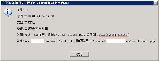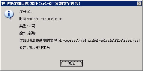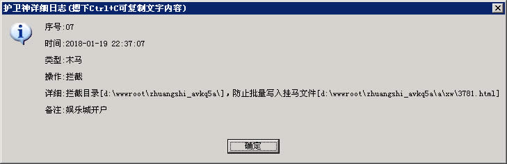 護(hù)衛(wèi)神·防入侵系統(tǒng)”,在上傳時和存儲時都會實時查殺網(wǎng)頁木馬,有效查殺99.9%的網(wǎng)頁木馬。對于批量生成垃圾文件這種行為,也能有效防護(hù)。效果演示圖如下: