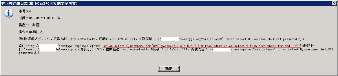 護(hù)衛(wèi)神·防入侵系統(tǒng)”,自帶過濾詞庫,無需改寫程序,過濾SQL注入。下面為攔截效果圖: